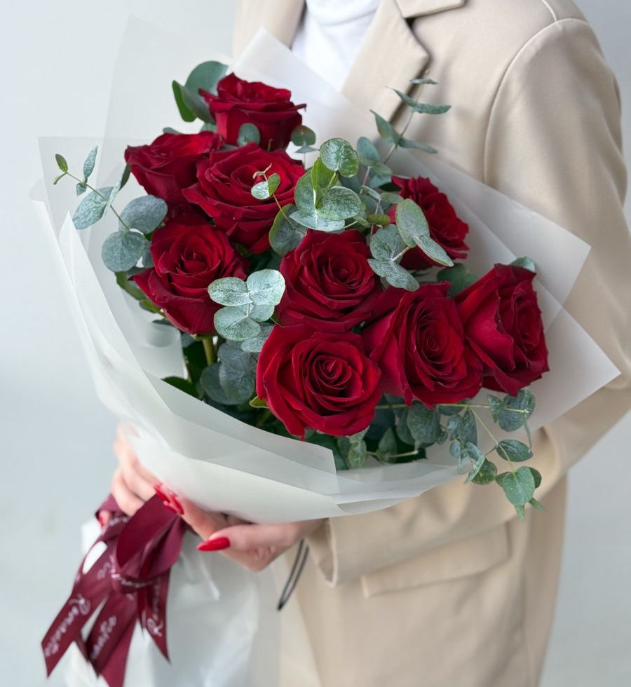 A bouquet of premium red roses accented with fragrant eucalyptus. Each flower is carefully selected for vibrant color and perfect harmony with greenery. Elegantly wrapped, this bouquet is versatile — ideal for romantic gestures, birthdays, or any special occasion.