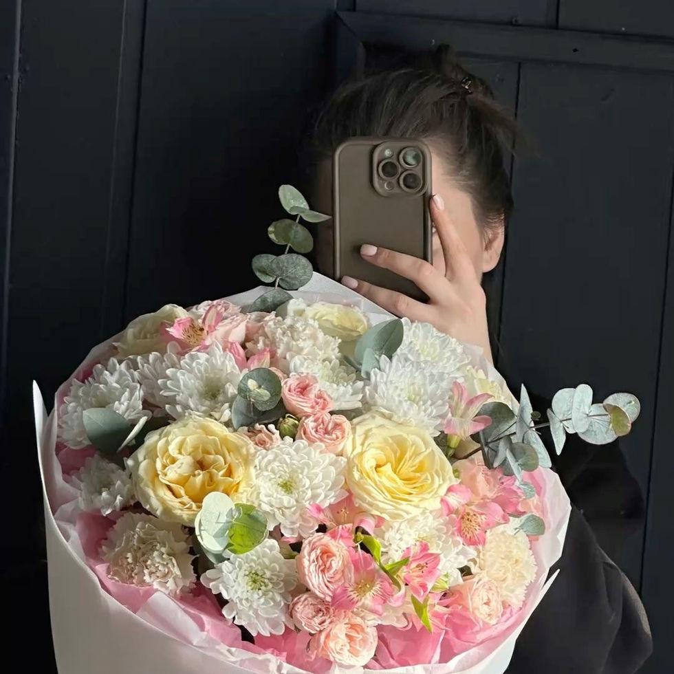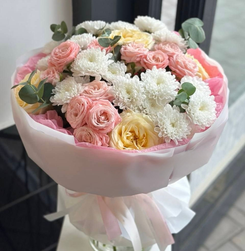 An elegant bouquet featuring large garden-style peony roses, delicate spray roses, and soft spray chrysanthemums. Crafted exclusively with premium-quality flowers, each bloom is carefully selected to create a perfectly balanced and refined arrangement. Gentle, timeless, and sophisticated — this bouquet is an ideal choice for a thoughtful gesture, birthday celebration, or any special occasion.