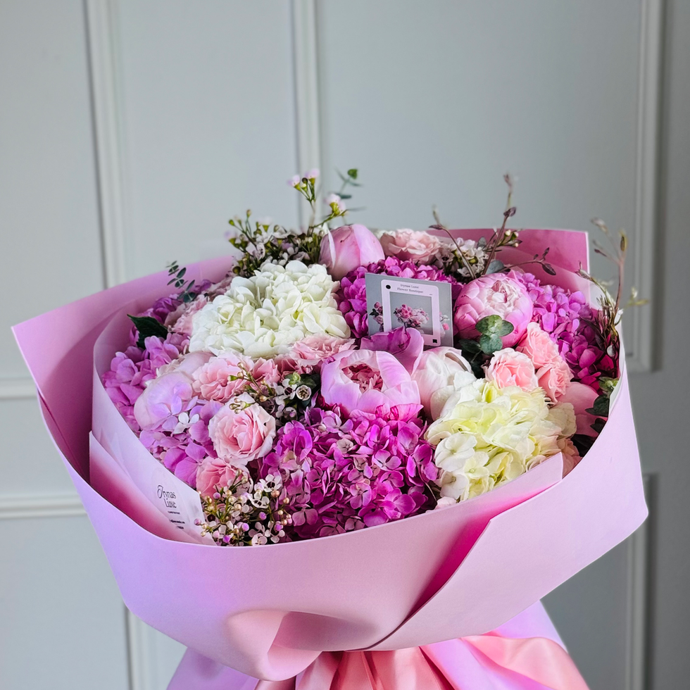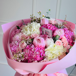 A charming bouquet in delicate shades of white and pink, filled with softness and grace. It’s made to bring joy, admiration, and express feelings without words. Airy hydrangeas, lush garden roses, and exotic accents, complemented by fragrant eucalyptus, come together in a perfectly balanced and harmonious arrangement.