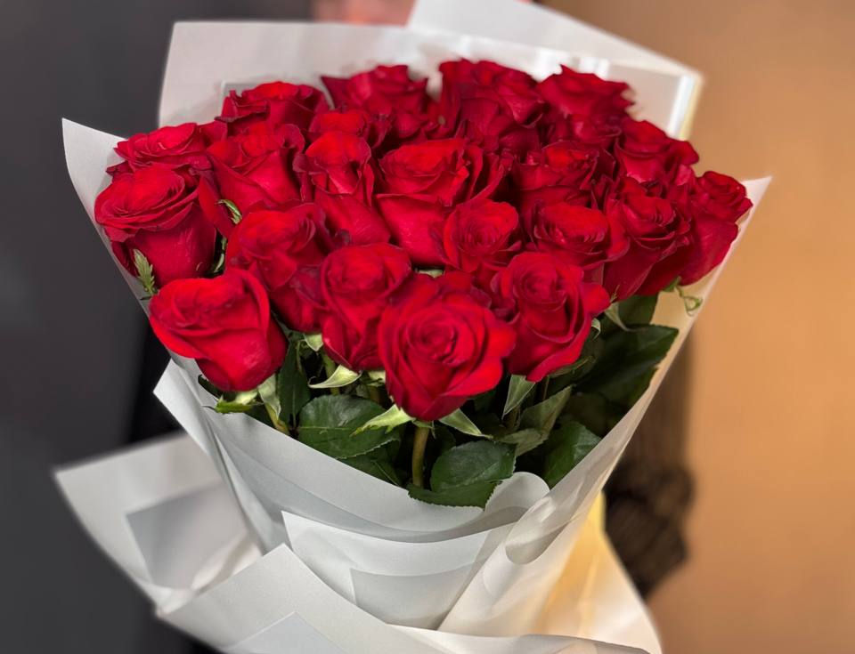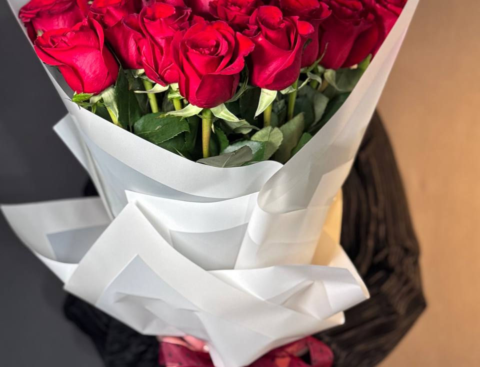 A bouquet of 25 exquisite red roses – the perfect way to express passion, love, and admiration. Carefully arranged in stylish packaging that enhances its elegance.