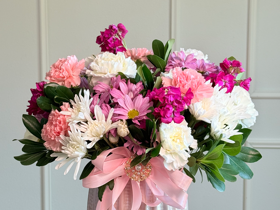 The “Compliment” bouquet is a delicate and charming way to express warm feelings without saying a word. Featuring fragrant matthiola, airy chrysanthemums, and graceful carnations, this arrangement creates a soft and harmonious look. Accented with fresh greenery and presented in a stylish vase, it radiates tenderness and thoughtfulness.