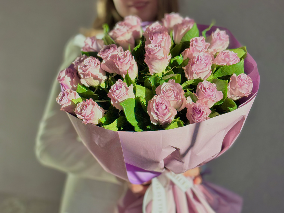 A breathtaking bouquet of fresh, long-stemmed lavender roses, symbolizing mystery, enchantment, and admiration. The soft pastel hue creates a delicate and sophisticated look, making it a perfect choice for any special occasion.