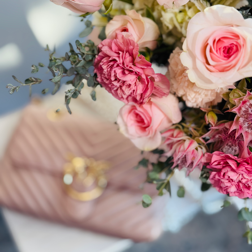 A luxurious floral arrangement in a stylish gift box, crafted with fresh, premium flowers for an exquisite and romantic look. The soft shades of pink and white create a delicate and elegant composition, making it the perfect gift for any special occasion.
