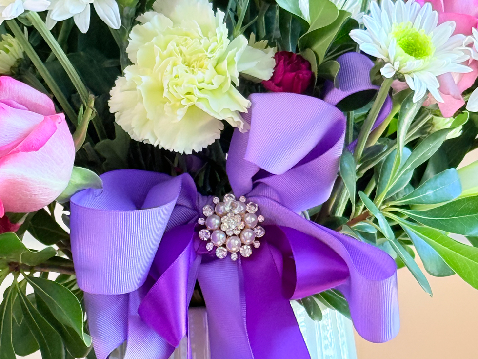 A vibrant and lush floral arrangement in rich pink, purple, and white tones, accented with a luxurious purple ribbon and presented in an elegant vase.