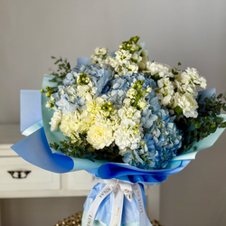 An elegant bouquet in cool pastel shades, reminiscent of the purity of the morning sky. Blue hydrangeas, snow-white matthiolas, and delicate cream carnations create a harmonious combination, emphasizing the sophistication and lightness of the composition. This bouquet is a symbol of tenderness and tranquility, making it a perfect gift for any occasion.