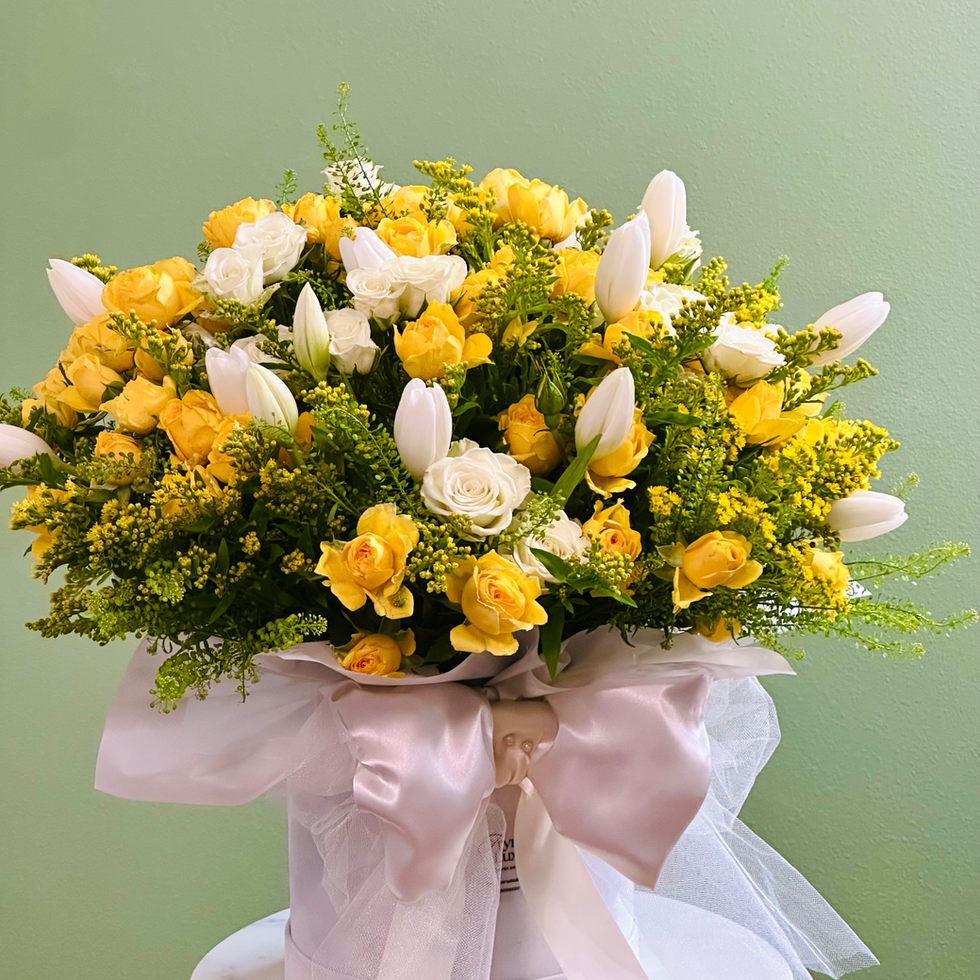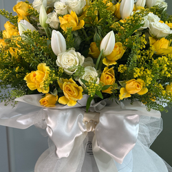 Bring warmth and joy into someone’s day with this vibrant arrangement. Delicate spray roses, elegant tulips, and golden solidago come together in perfect harmony to create a light and uplifting bouquet full of spring energy.