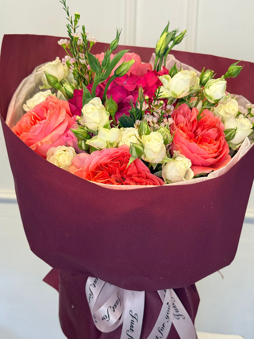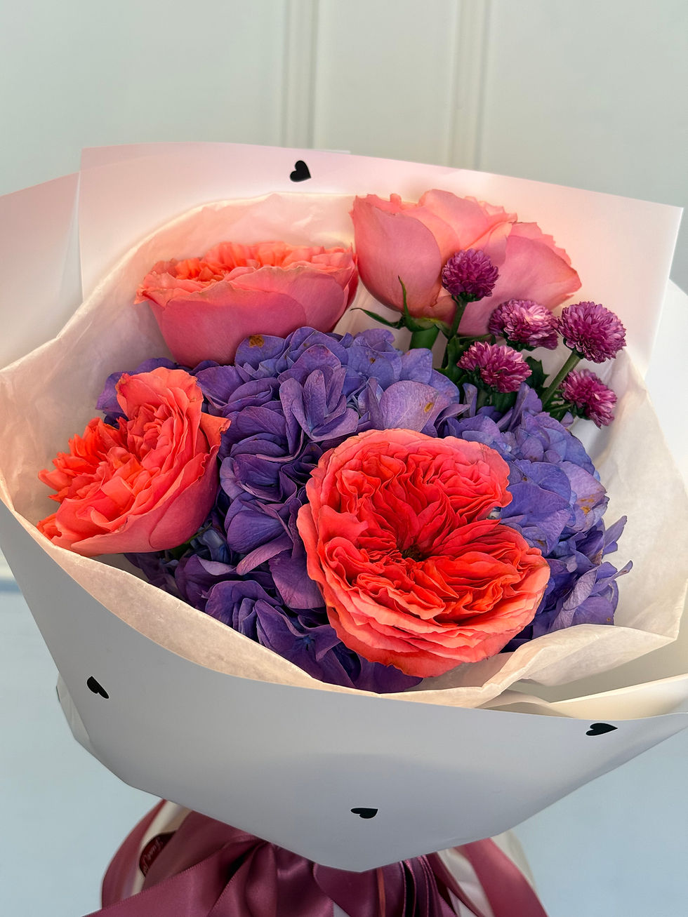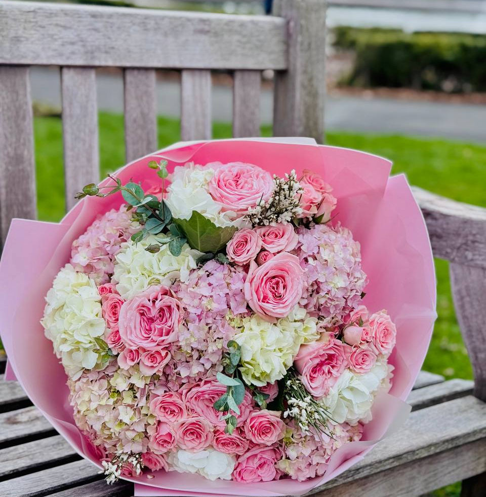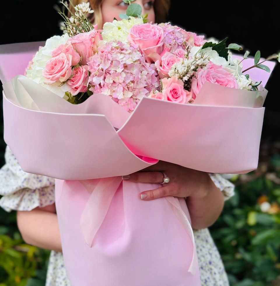 A charming bouquet in delicate shades of white and pink, filled with softness and grace. It’s made to bring joy, admiration, and express feelings without words. Airy hydrangeas, lush garden roses, and exotic accents, complemented by fragrant eucalyptus, come together in a perfectly balanced and harmonious arrangement.